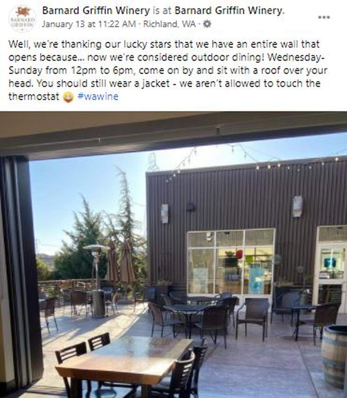 And Barnard Griffin Winery in Richland is also rolling up a “wall” to seat people inside. “.... (N)ow we’re considered outdoor dining! ... come on by and sit with a roof over your head,” it posted.
