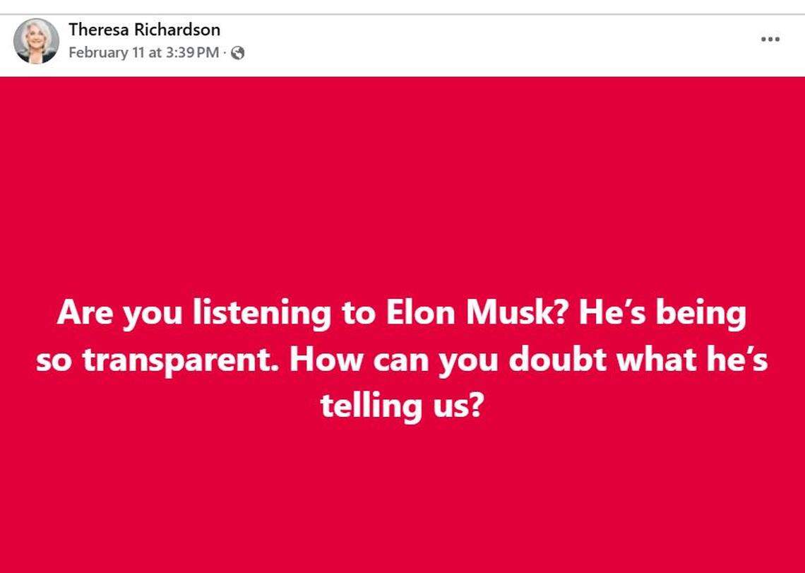 “Are you listening to Elon Musk? He’s being so transparent. How can you doubt what he’s telling us?” read the post to Richardson’s private Facebook account.