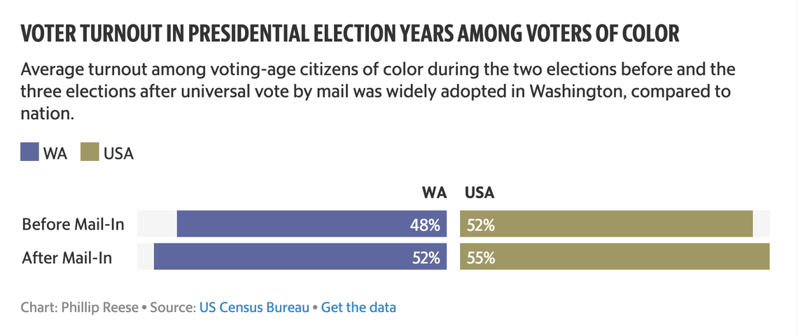 Washington’s voting-eligible residents of color have also been increasing their participation in elections since vote by mail went into full effect, according to Census Bureau data.