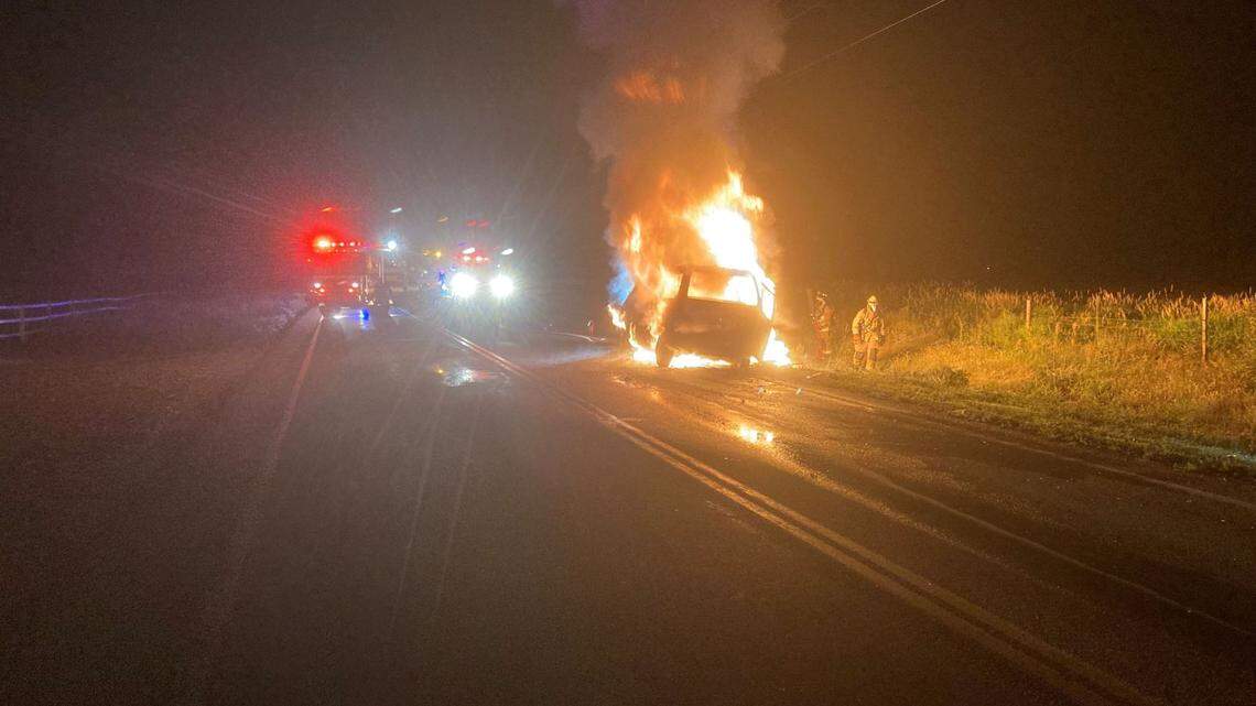 Van bursts into flames after hitting deer on Idaho highway, photos show