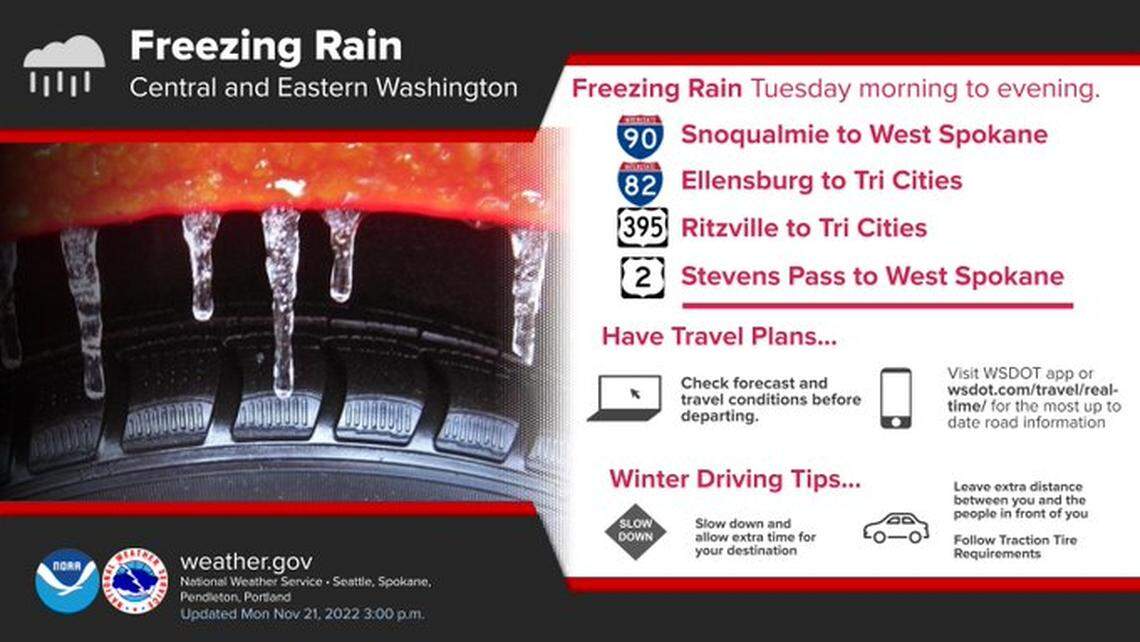 The weather service says freezing rain, possibly mixed with snow, also is forecast Tuesday at Snoqualmie Pass on Interstate 90; from Ellensburg to the Tri-Cities on Interstate 82; and from Ritzville to the Tri-Cities on Highway 395.