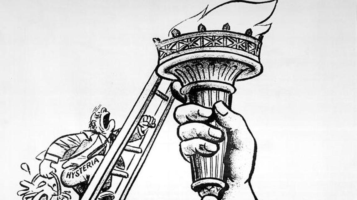 I am reminded lately of a 1949 political cartoon with the caption “Fire!” that pictured a hysterical man racing up a ladder with a bucket of water to extinguish the torch on the Statue of Liberty.